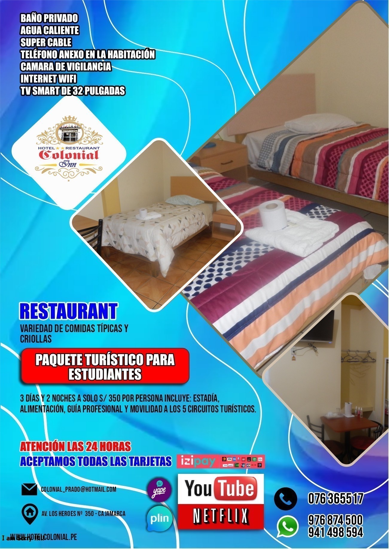 Actualmente estamos con categoría de HOTEL 2 ESTRELLAS y continuamos con nuestro nombre de COLONIAL INN pese a que la construcción es totalmente moderna, pero ya que nuestro prestigio y fama es conocido por nuestros clientes potenciales. Contamos con una TARIFA CORPORATIVA y descuentos especiales a grupos o delegaciones con el fin de dar un buen servicio a todos nuestros clientes, los precios incluyen IGV. Emitimos: BOLETA Y FACTURA ELECTRONICA